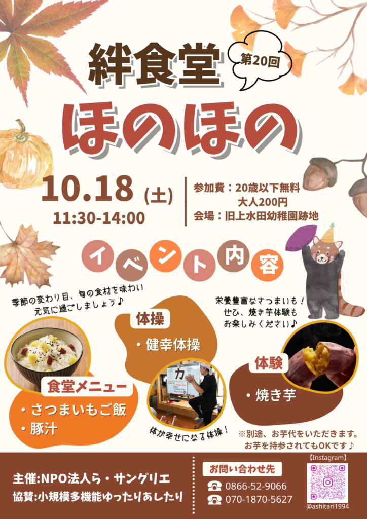 10 162025 〇地域食堂 10月 案内〇 お知らせ こんにちは☺いつもありがとうございます。 10月の地域食堂を 10月18日(土)11:30~予定しています(^^)/ 是非、お越しくださいませ!今回は、事業所で栽培しみんなで収穫したサツマイモご飯、豚汁、フルーツポンチになります! また、焼き芋の体験も用意していますので、焼きたてを食べにお越しくださいませ♪ Tweet Share Hatena Pocket RSS feedly Pin it 〇小規模多機能ゆったりあしたり電話番号の変更について〇 前の記事